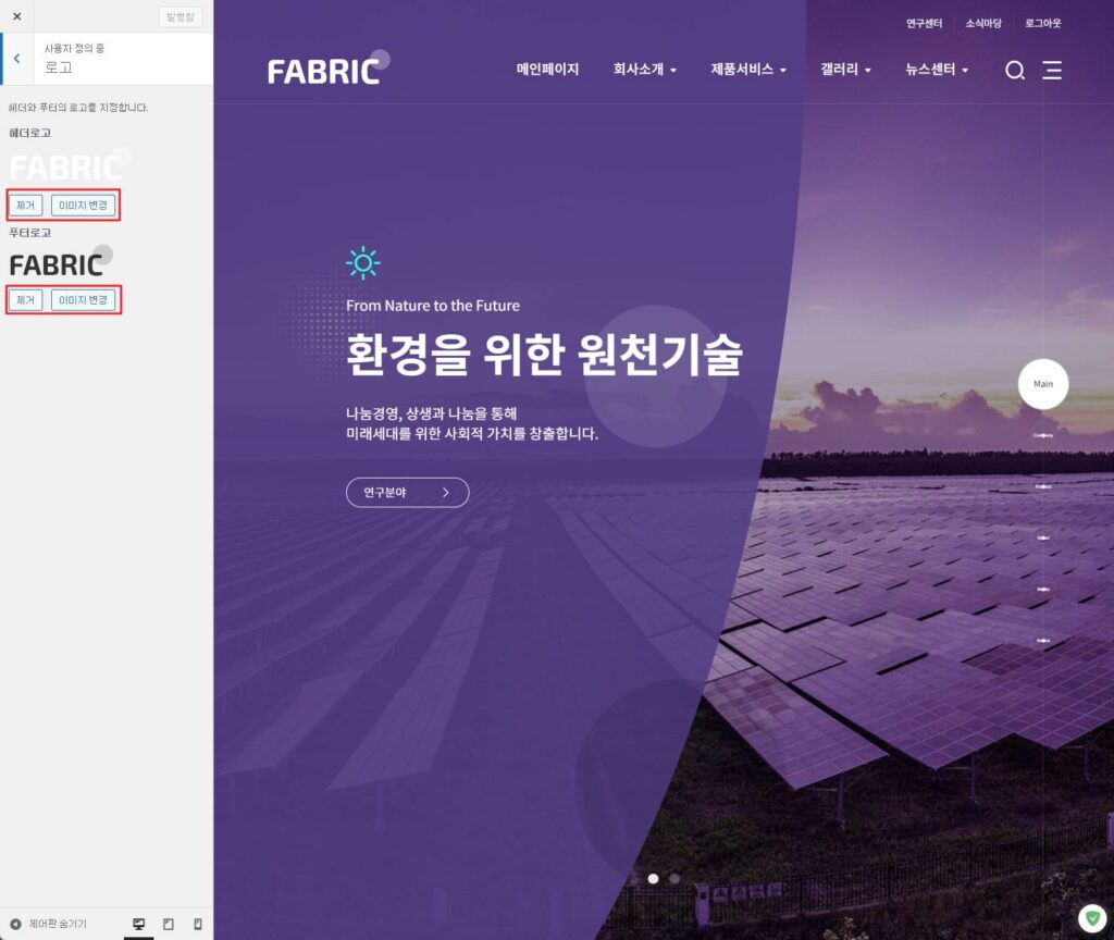 관리자화면- 외모 – 사용자정의하기 – 로고