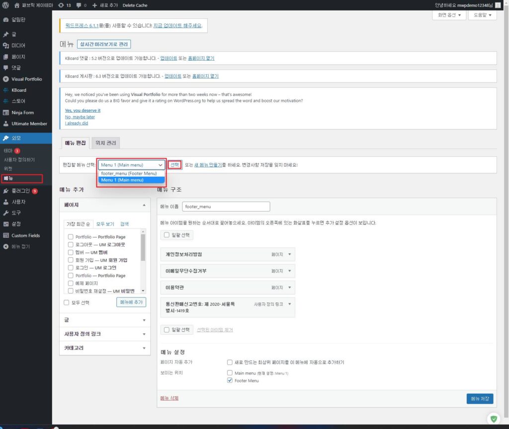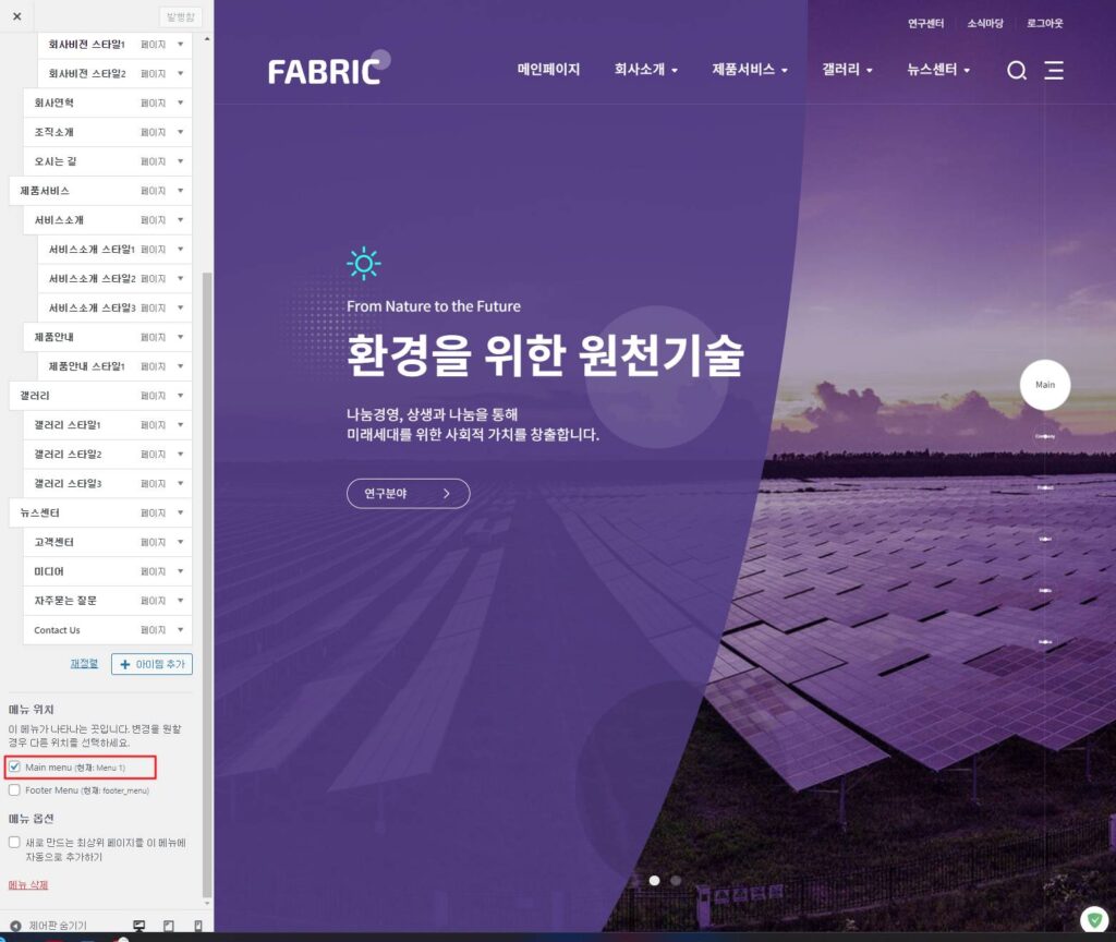 관리자화면 – 외모 – 사용자정의하기 – 메뉴 / 사용자가 생성한 메뉴를 테마와 연결하는 작업을 합니다.